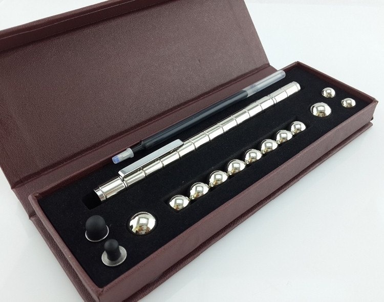 Интересная ручка, позволяющая снять стресс. Она состоит из небольших элементов. Их можно собирать между собой, словно детали конструктора. Ручку применяют в качестве стилуса для сенсорных устройств. Она пригодится как циркуль. Также её элементы могут закреплять документы на магнитной доске. Если собрать все элементы в ручку, то она будет писать черными чернилами.