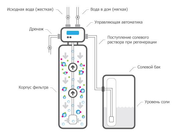 - Ионообменные фильтры. Наиболее эффективный способ. Вода проходит через фильтрующую загрузку (чаще всего ионит), которая обменивает ионы жесткости на менее вредные натрия или водорода. Нуждаются в периодической регенерации соляным раствором.