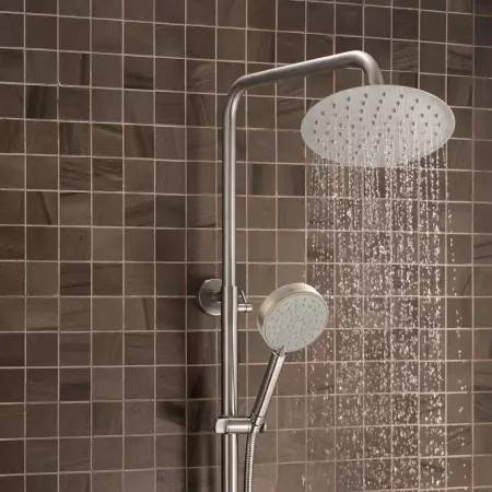 - Материал. Выбирать следует душевую стойку, выполненную из латуни или нержавеющей стали. Подобный материал имеет хорошие антикоррозийные качества, а значит способен радовать своих обладателей достаточно долгим сроком эксплуатации. Изделия из силумина обойдётся в разы дешевле, но такие модели слишком хрупкие и не долговечные.