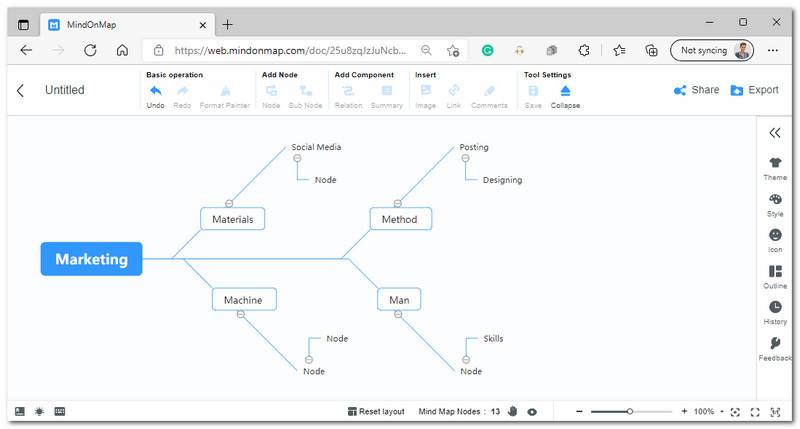 Инструмент поддерживает совместную работу, прост в обмене проектами для обсуждения идей и позволяет добавлять уникальные значки для персонализации карт. К тому же, обеспечивает быстрый доступ к узлам через параметр Outline и автоматическое сохранение данных, а еще поддерживает экспорт в форматы PNG, JPG и SVG.