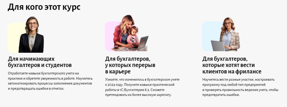 - Бухгалтерам после перерывов в карьере. Вы узнаете о всех изменениях, связанных с бухгалтерией, до 2024 года, овладеете практическими навыками работы с программой 1С: Бухгалтерия 8.3 и сможете претендовать на более высокую зарплату.