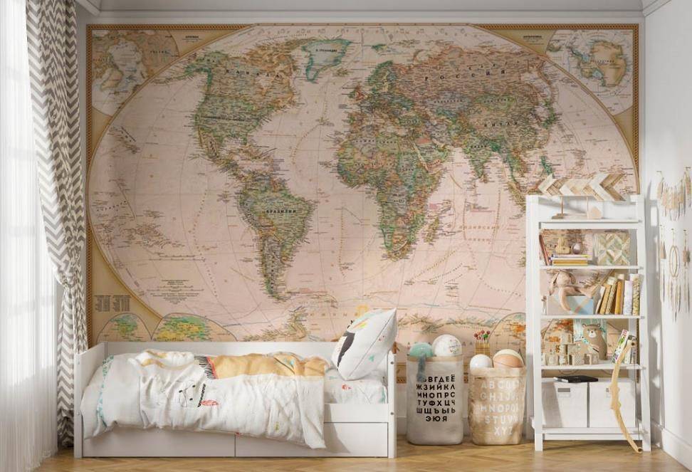 3. Ретро и винтажные мотивы. Фотообои и фрески с винтажными рисунками, ретро-фотографиями или фотообои карта мира придают интерьеру шарм и уют, создавая теплую и ностальгическую атмосферу.