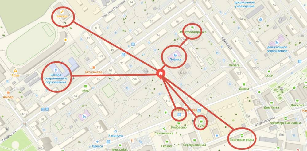 - оценить близость школ, детских садов, поликлиник и магазинов;