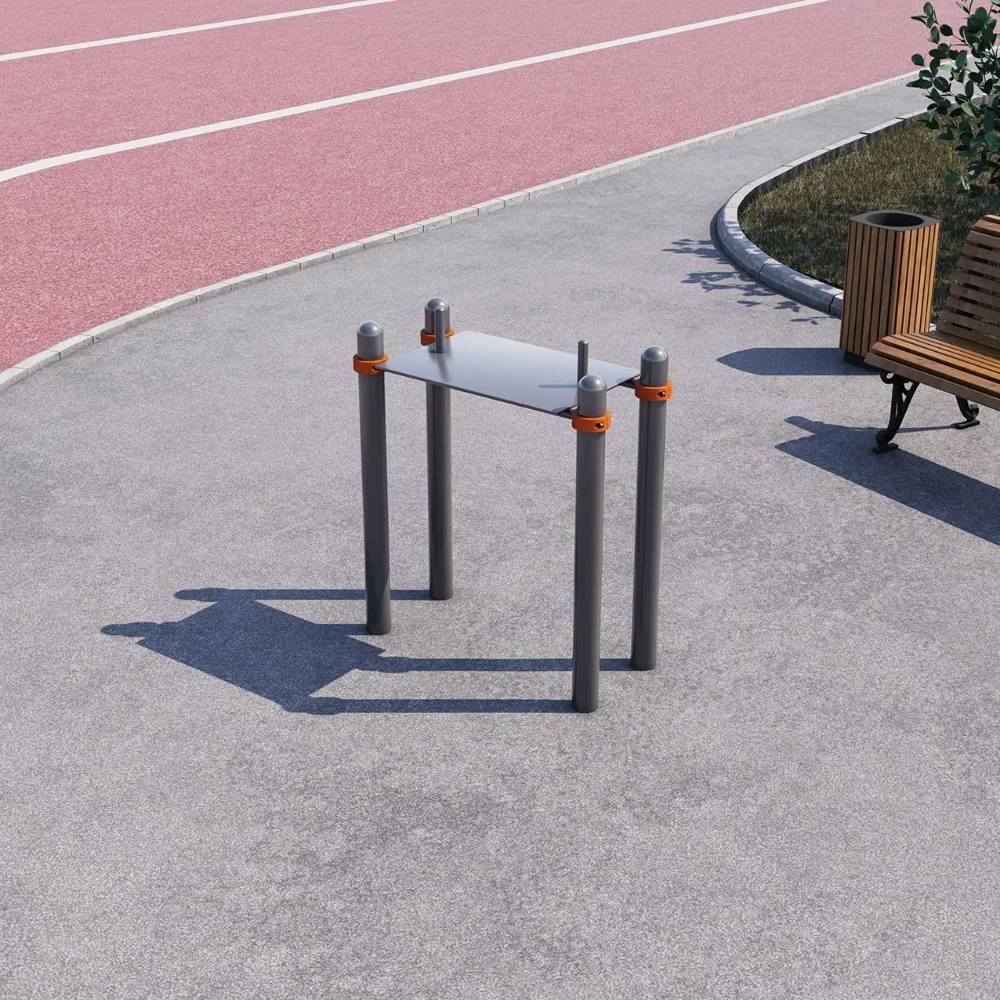 Параллельные брусья дополняют комплекс базовых снарядов. Они незаменимы для тренировки грудных мышц, трицепсов и развития баланса. На них можно выполнять отжимания, махи ногами и статические удержания.