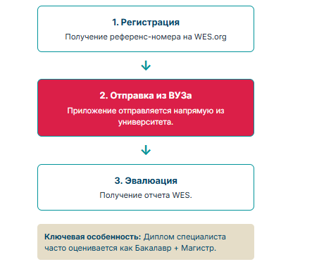 Самый ответственный этап — отправка документов. Приложение к диплому (академическая справка) должно быть отправлено в WES напрямую из вашего российского вуза в запечатанном конверте. Заявитель не имеет права отправлять этот документ самостоятельно. Приятный бонус для россиян — пятилетний диплом специалиста WES часто оценивает как эквивалент степеней бакалавра и магистра, что дает значительные преимущества.