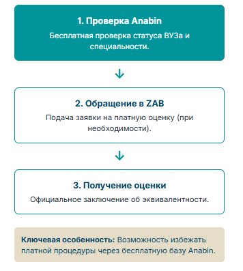Германия предлагает уникальную двухступенчатую систему. Первый шаг — самостоятельная и бесплатная проверка по онлайн-базе данных Anabin. Если ваш вуз имеет в базе статус H+, а специальность оценена как эквивалентная («gleichwertig»), распечаток с сайта может быть достаточно для трудоустройства по нерегулируемой профессии.