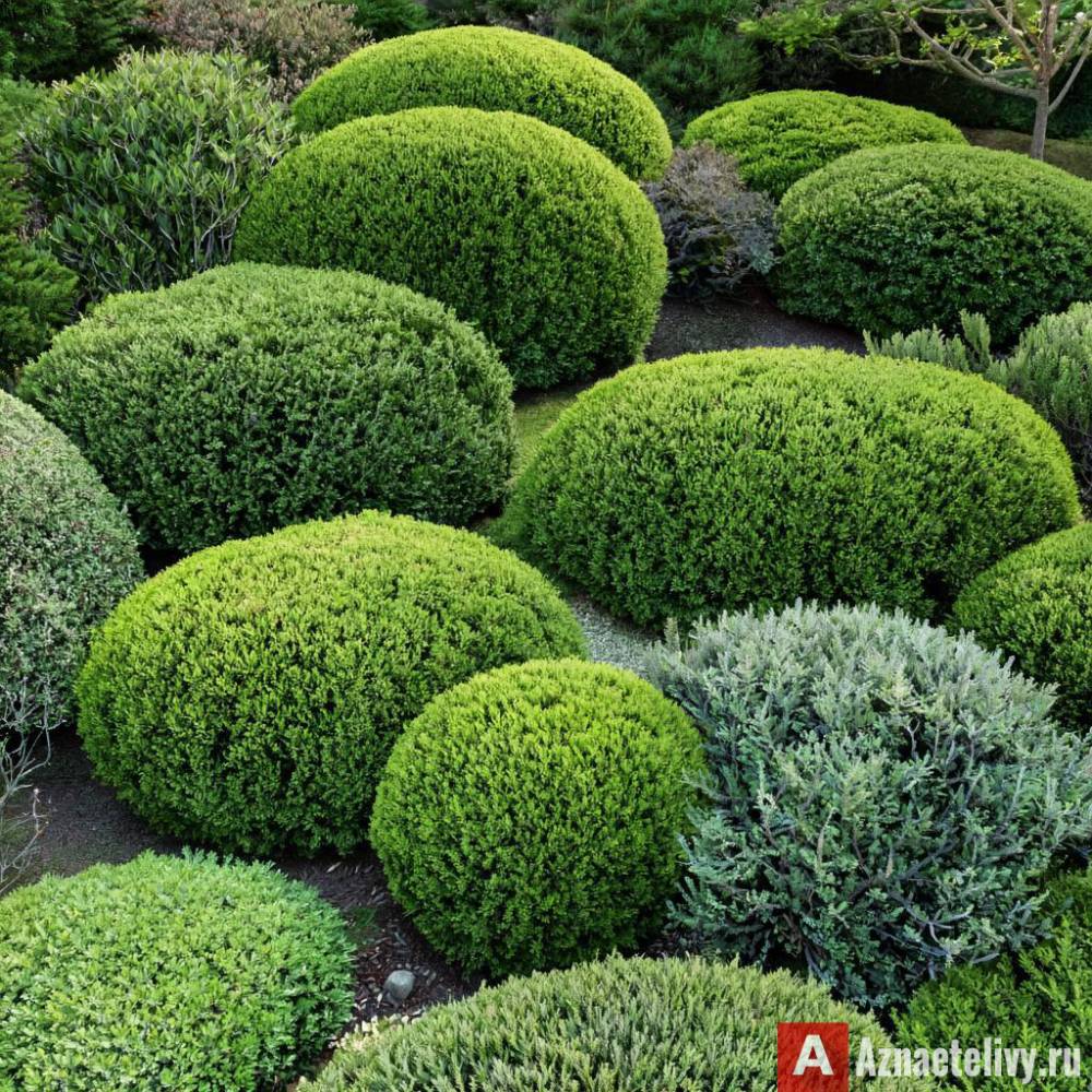 - Кустарники: гортензии, спиреи, барбарисы, можжевельники, туи.