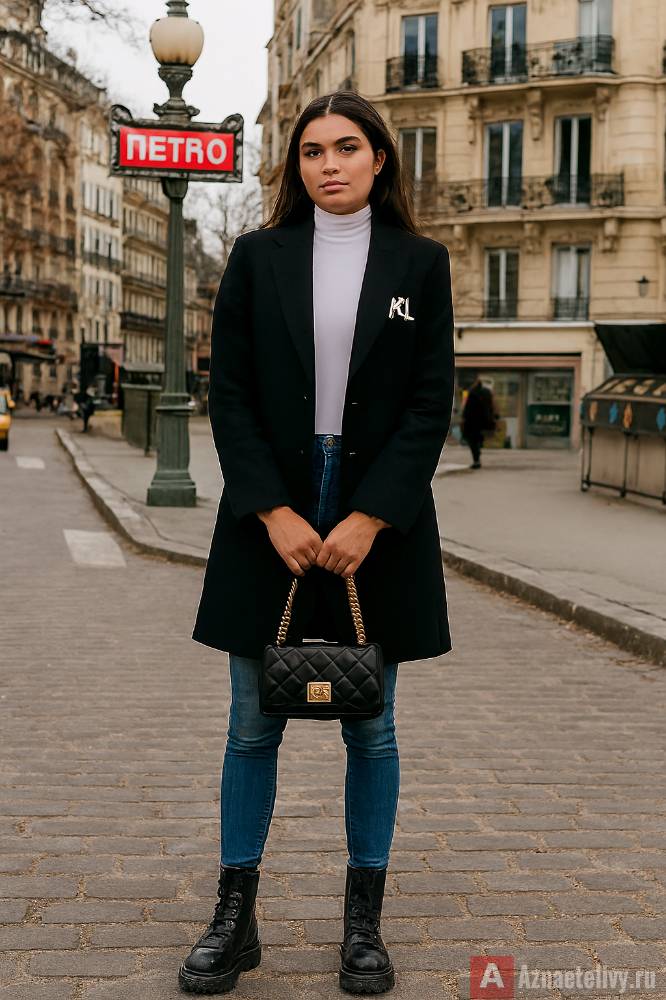 - Монохром + деним Джинсы прямого кроя в паре с чёрным жакетом и белой рубашкой — отсылка к культовому визуальному коду самого Лагерфельда. Такой образ работает как визуальное высказывание: строго, лаконично, уверенно.