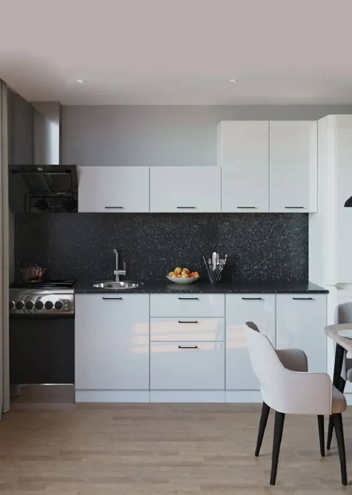 Мини-кухня выигрывает от непрерывной рабочей поверхности. Толщина 28–38 мм — компромисс между прочностью и визуальной лёгкостью. Радусные кромки уменьшают сколы. Фартук высотой 500–600 мм защищает стену в «мокрой» и «горячей» зонах; монолитные решения с минимумом швов упростят уборку. В местах примыкания — уплотнение и герметик, чтобы исключить подтеки.