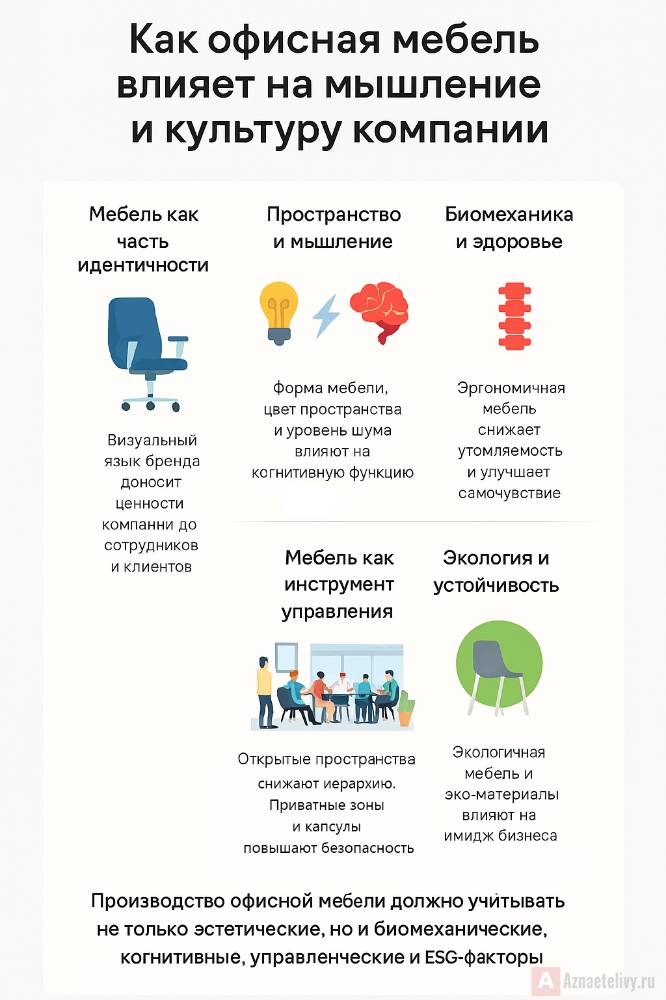 По словам дизайнера интерьеров Ольги Косыревой, «офисная мебель — это визуальный интерфейс компании. Она может транслировать открытость, иерархию, гибкость или строгость. И это считывается мгновенно».