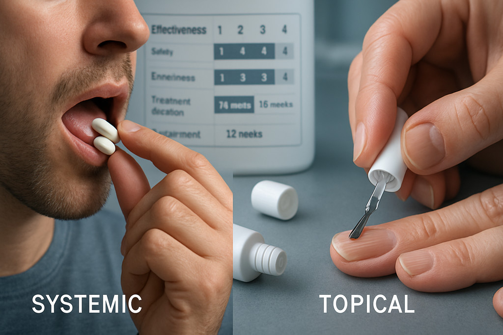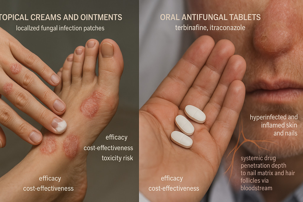 Клинические показания к предпочтению системной терапии включают распространенность дерматомикоза более 500 см или более 20% площади тела, онихомикоз с поражением более 50% ногтевой пластины или вовлечением матрикса, множественное поражение 3 и более ногтей, микоз волосистой части головы любой распространенности, неэффективность предшествующей местной терапии в течение 8-12 недель. Местная терапия остается выбором при ограниченных поражениях менее 3 ногтей с вовлечением дистальной трети пластины без поражения матрикса, дерматофитии гладкой кожи площадью менее 100 см, противопоказаниях к системным препаратам (тяжелое заболевание печени, беременность, множественная лекарственная терапия с риском взаимодействий).