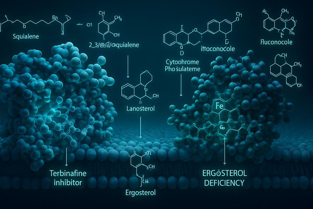 Блокировка синтеза эргостерола происходит на двух ключевых этапах биосинтетического пути в зависимости от класса антимикотика. Тербинафин ингибирует скваленэпоксидазу на ранней стадии, останавливая превращение линейной молекулы сквалена (C??H??) в циклический 2,3-оксидосквален через эпоксидирование двойной связи между атомами С2 и С3. Азолы блокируют ланостерол-14α-деметилазу на поздней стадии, предотвращая удаление метильной группы от атома С14 молекулы ланостерола — критический шаг для последующего формирования эргостерола с характерной системой сопряженных двойных связей в кольце B.