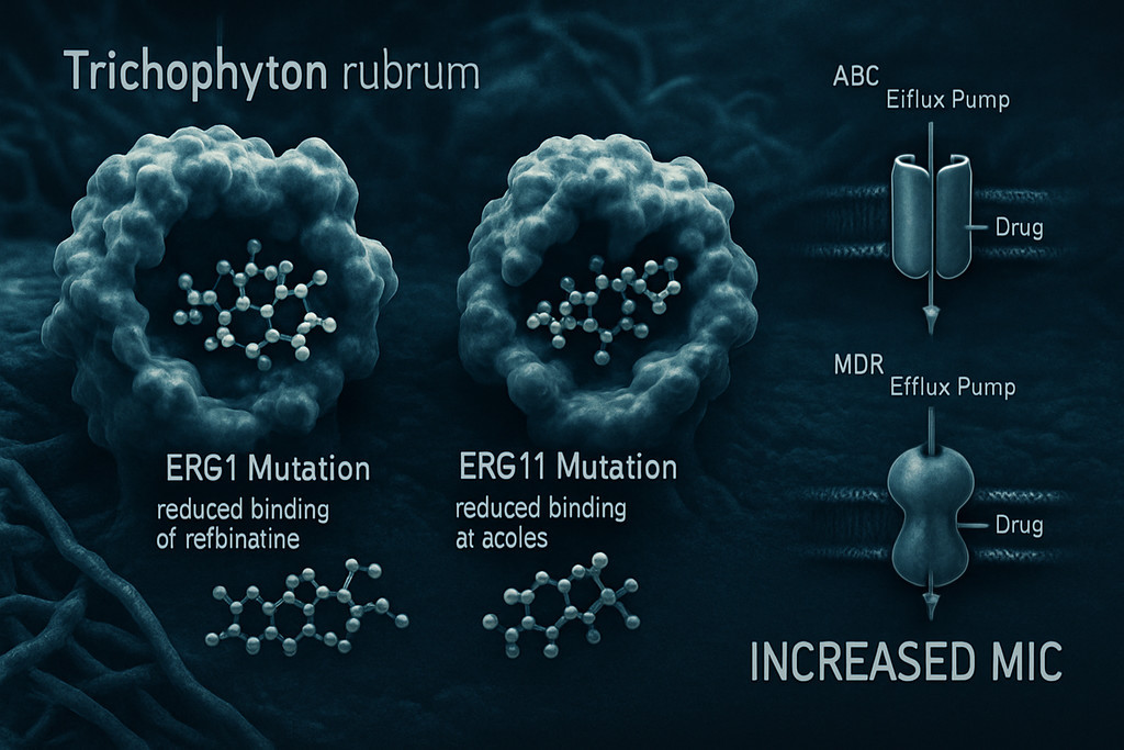 Молекулярные механизмы резистентности к тербинафину основаны на точечных мутациях гена ERG1, кодирующего скваленэпоксидазу, с наиболее частыми заменами аминокислот Leu393Phe, Phe397Leu, Leu393Ser в активном центре фермента. Эти мутации снижают аффинность связывания тербинафина с ферментом в 100-500 раз, повышая минимальную ингибирующую концентрацию с 0,001-0,01 мкг/мл у чувствительных штаммов до 1-10 мкг/мл у резистентных, что превышает достижимые терапевтические концентрации в тканях. Частота мутантных штаммов T. rubrum выросла с 0,5% в 1995 году до 2-4% в 2024 году согласно эпидемиологическим исследованиям в Европе и Северной Америке.