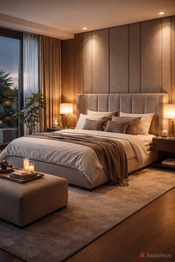 Освещение усиливает эффект. Тёплый мягкий свет у изголовья, направленная подсветка снизу основания или скрытые линии света вдоль стен создают ту самую атмосферу, в которой хочется отдыхать. Всё работает на ощущение гармонии.