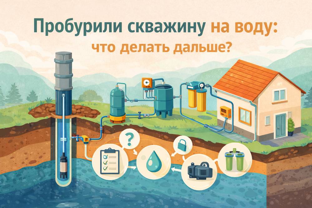 Скважина уже на участке, буровая уехала, а дальше начинается самое важное: превратить «дырку с водой» в нормальное водоснабжение для дома. Ниже — понятный план, что делать после бурения, чтобы не испортить насос, не получить мутную воду и не переделывать всё через сезон.