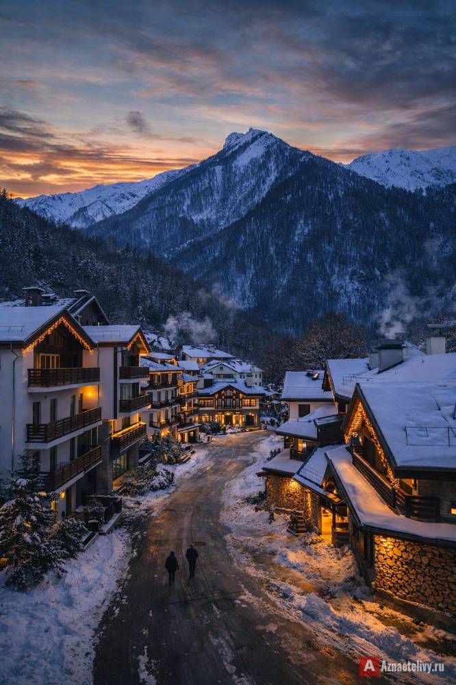 Зимний вечер здесь - это сочетание уюта и горной свежести. Даже короткая прогулка помогает почувствовать, что день завершён правильно: без спешки, с красивыми видами и ощущением, что горы рядом, даже если их скрывает темнота.